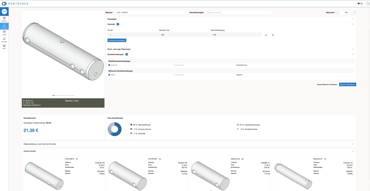 Alle diese Herausforderungen adressiert die KI-Softwarelösung PartSpace AI. Das 2019 in Deggendorf gegründete Unternehmen Easy2Parts GmbH hat sich auf die Digitalisierung der Fertigungsbranche spezialisiert und mit seiner Marke PartSpace eine KI-basierte Lösung für den technischen Einkauf entwickelt – ein Bereich, der bislang kaum digitalisiert wurde. PartSpace AI analysiert per Schnittstelle zu bestehenden IT-Systemen Einkaufs- und Konstruktionsdaten, um auf dieser Datenbasis Marktpreise zu ermitteln und dem Einkäufer konkrete Maßnahmen vorzuschlagen, um das beste Angebot zu finden. Dazu zählen beispielsweise gezielte Preisverhandlungen, die Wahl alternativer Lieferanten oder die Standardisierung bestimmter Bauteile. Auf diese Weise kann die Beschaffung der Bauteile kostengünstiger, effizienter und transparenter geplant werden.